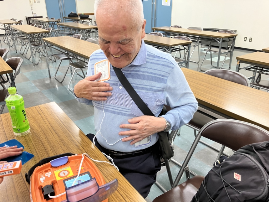 写真は、社福センターでAEDを身に着けて、いくつかの機能を試す、会員の柴引和信(しばひき かずのぶ)さん。